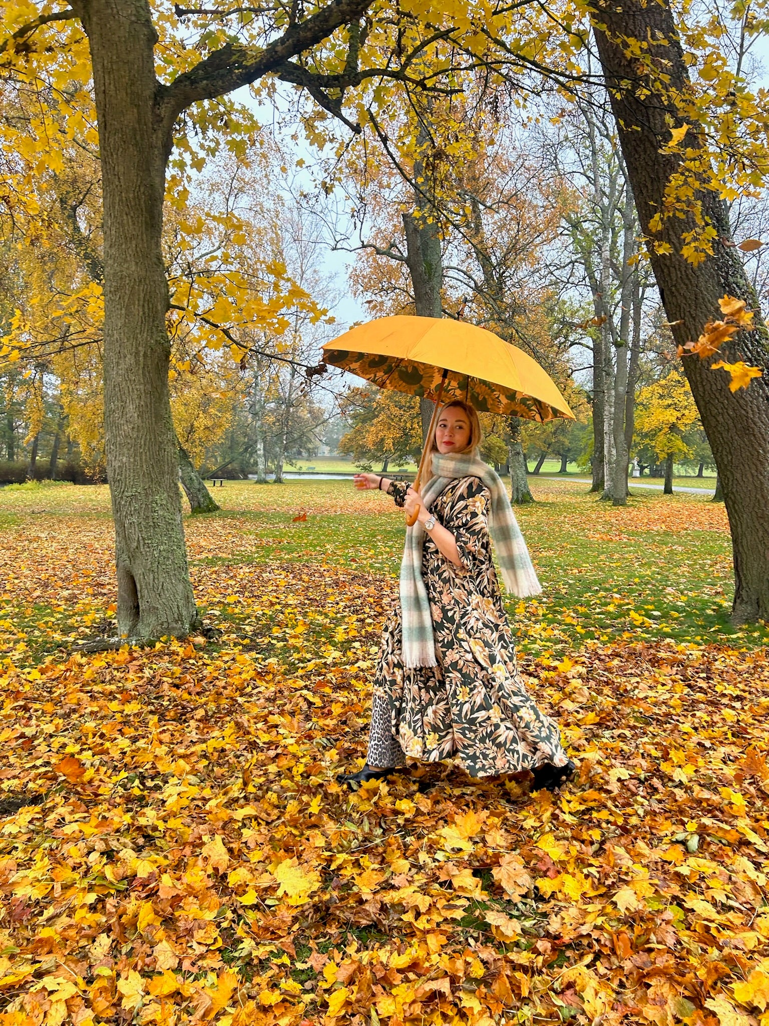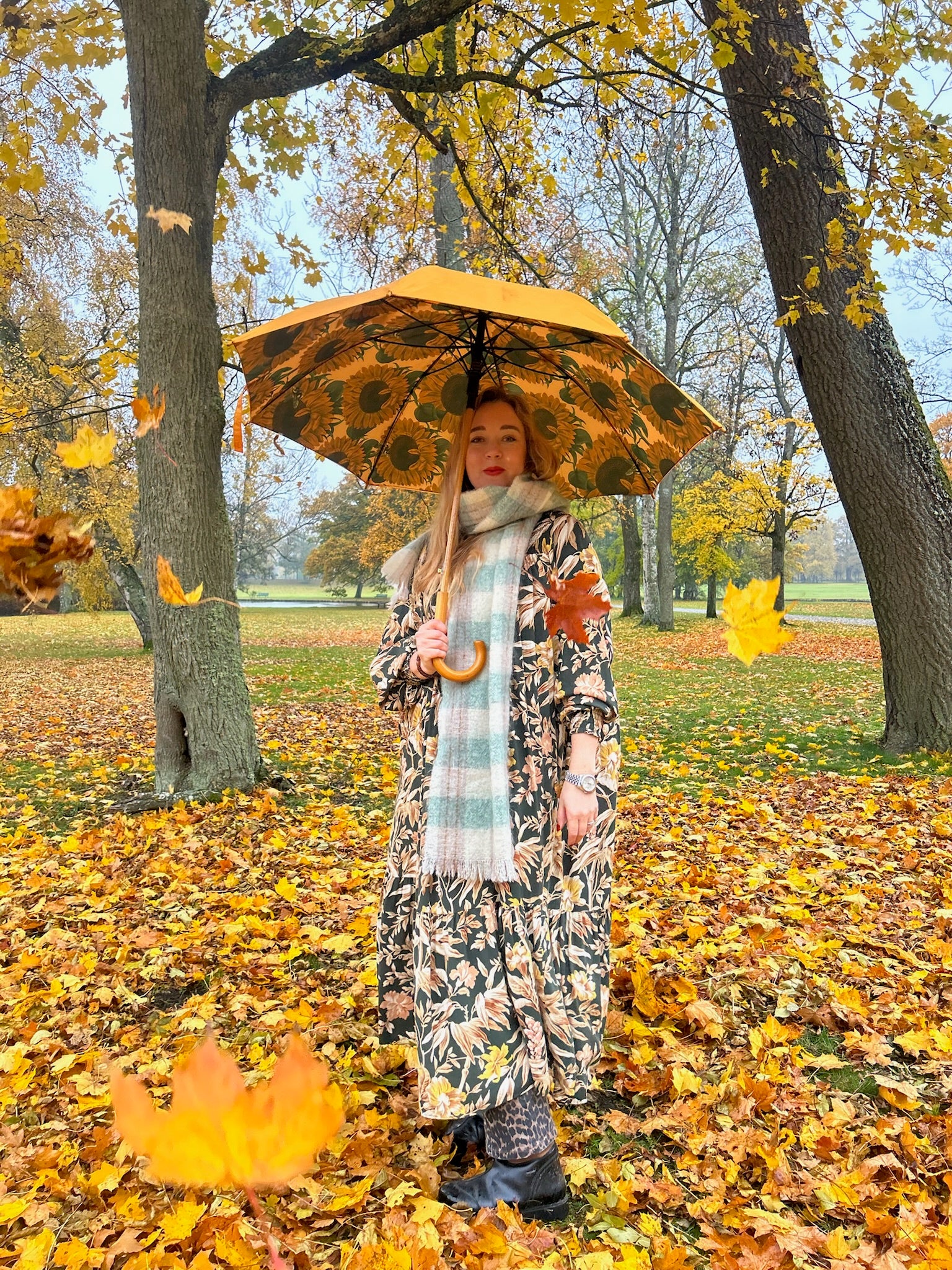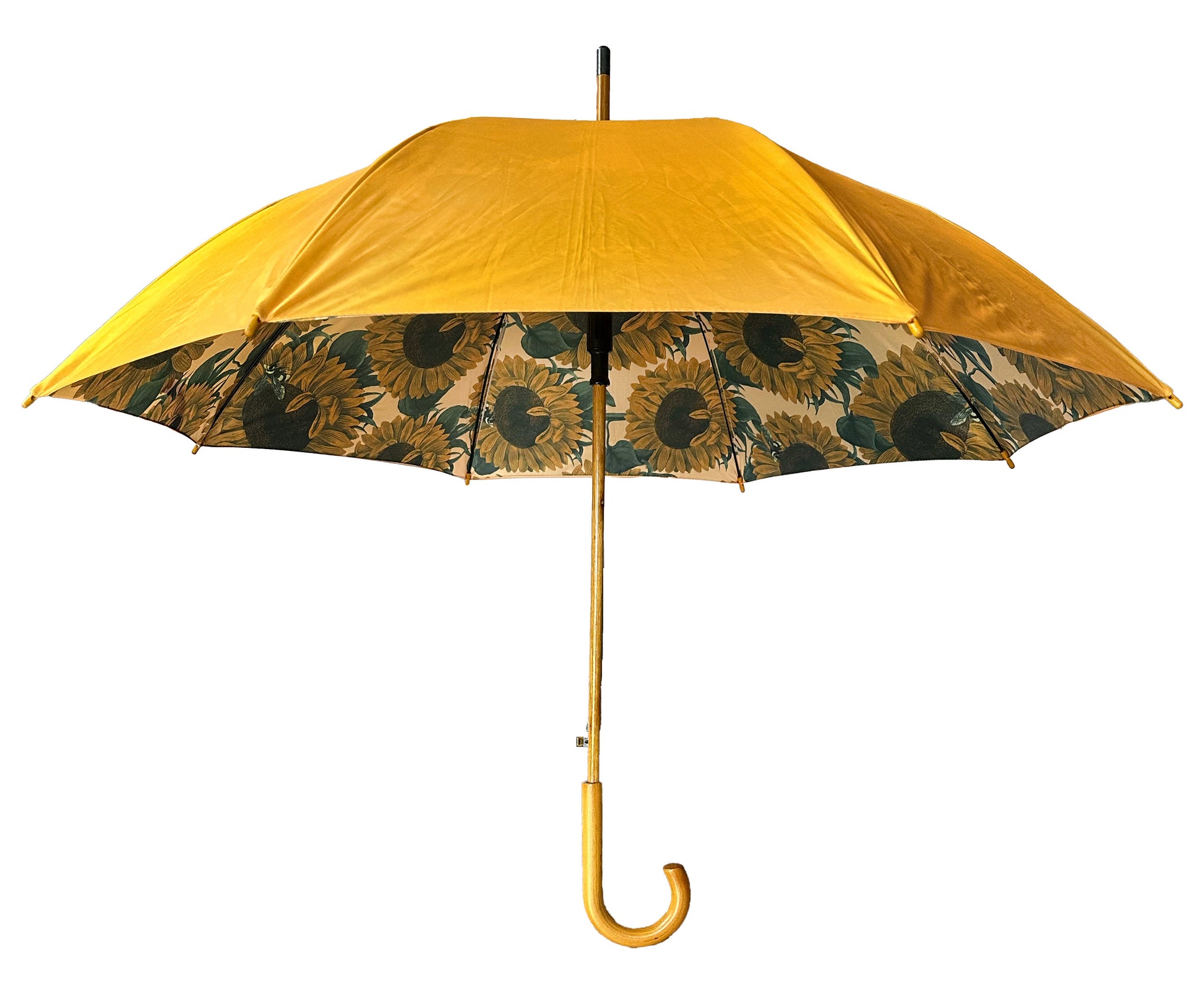 Paraplyet Sunday är enfärgat solrosgult på utsidan men slå upp det och du kommer att omges av underbara solrosor, dåligt väder är ett minne blott. Ett paraply som lyfter humöret en regnig höstdag utan att ge vika för funktionalitet. Skaftet är klassisk Mary Poppins inspirerat i trä med rundat handtag och med en smaragdformad knapp för automatisk öppning.
