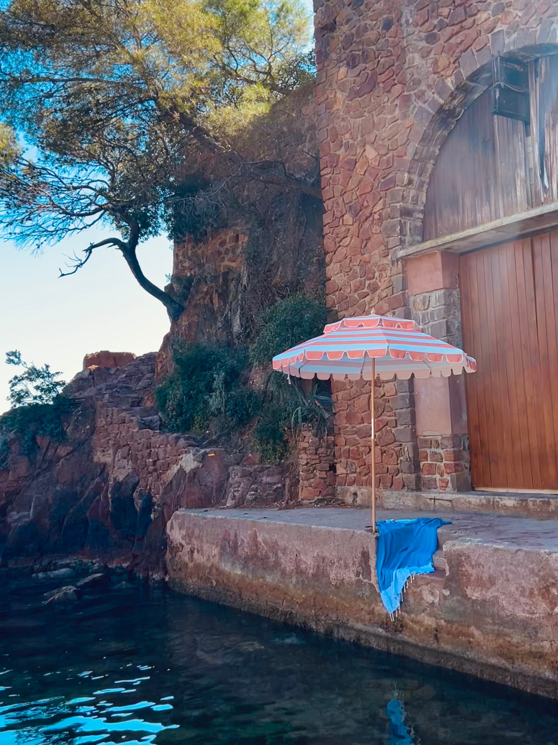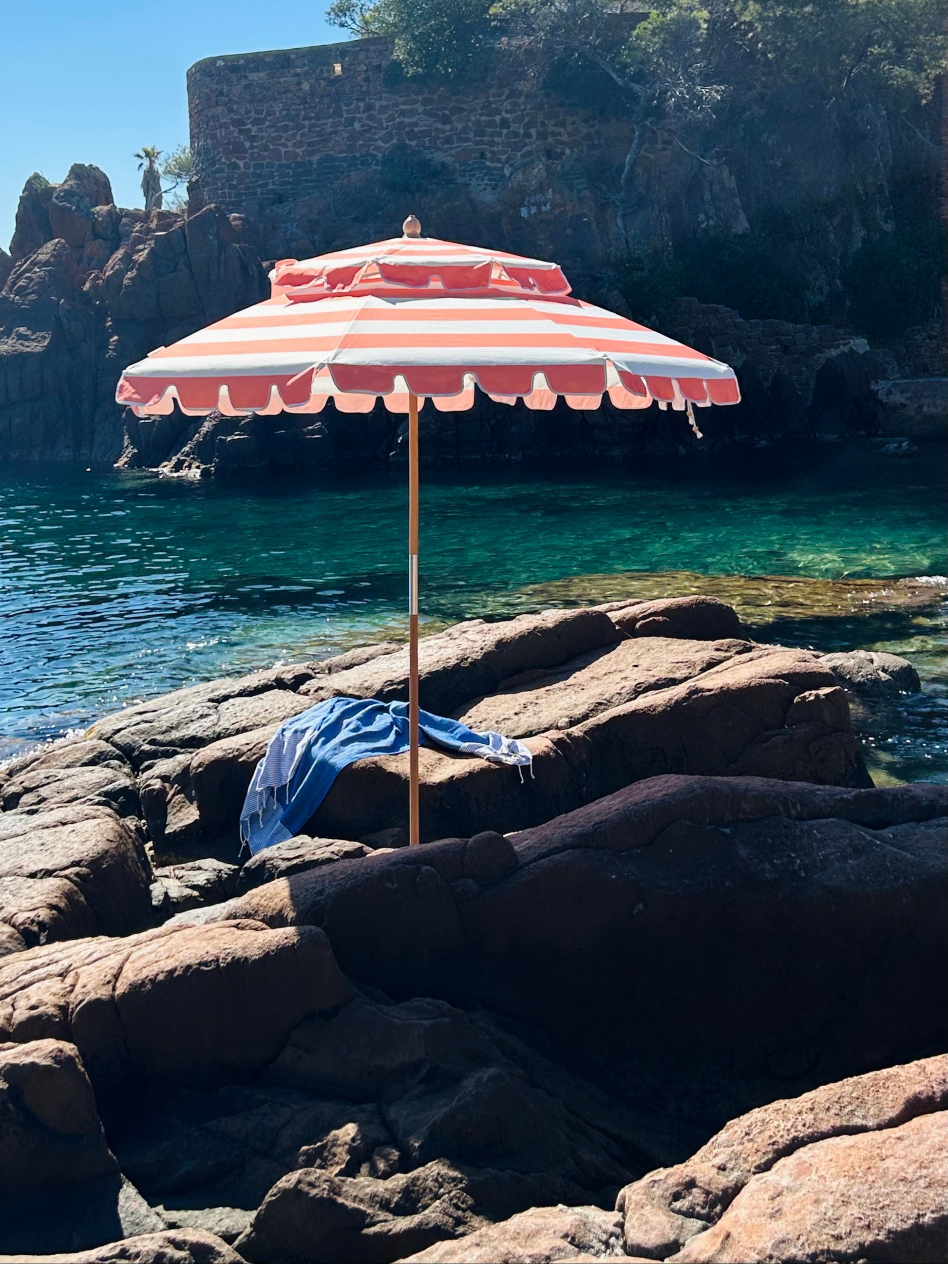 Bredrandigt i korall och vitt. Detta klassiskt randiga parasoll har fått en korallfärgade tvist som känns både varmt och välkomnande.