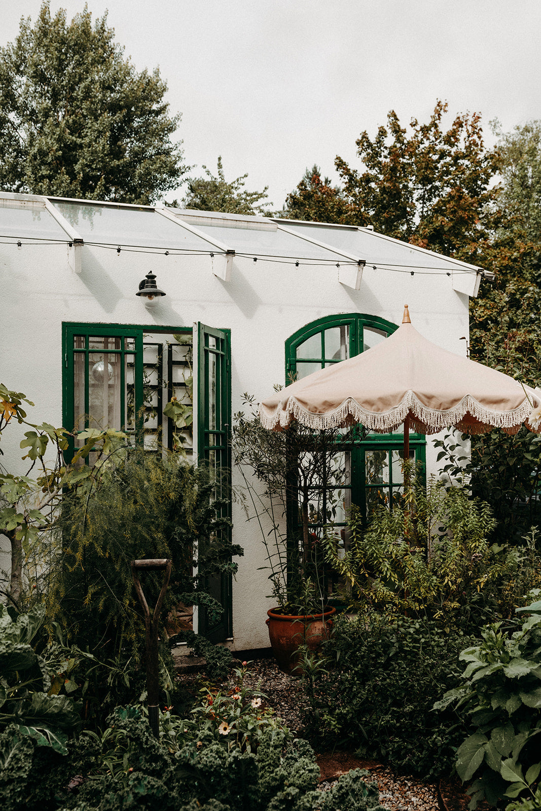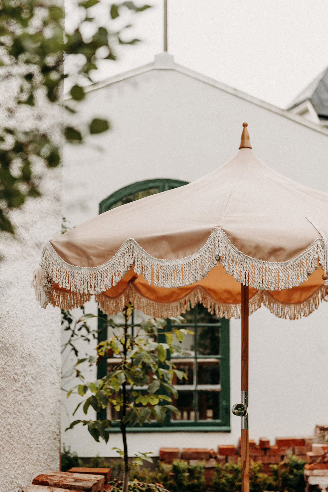 Detta marängformade parasoll med sin svarvade trätopp blir som ett smycke i trädgåden såväl som på balkongen.