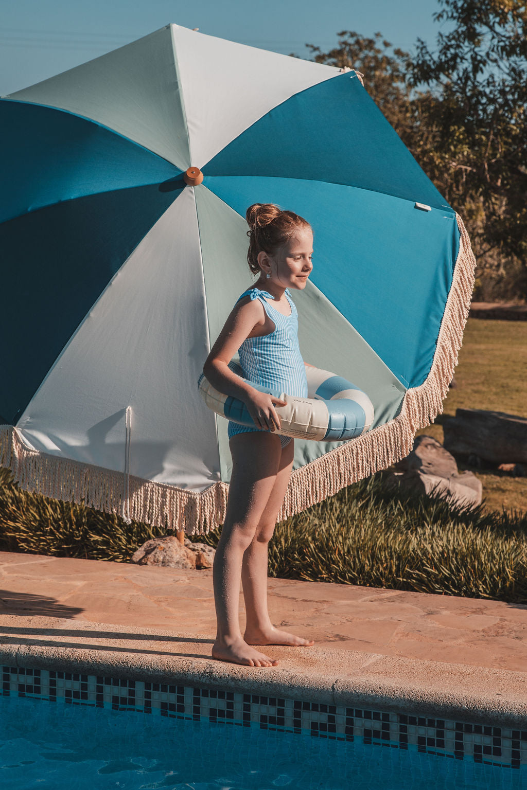 Palmeira är blockrandigt i marinblått, vitt, turkost och klarblått med naturfärgade bomullsfransar.  En riktig sommardröm! Med sitt fällbara skaft är det enkelt att fälla ihop och plocka undan.