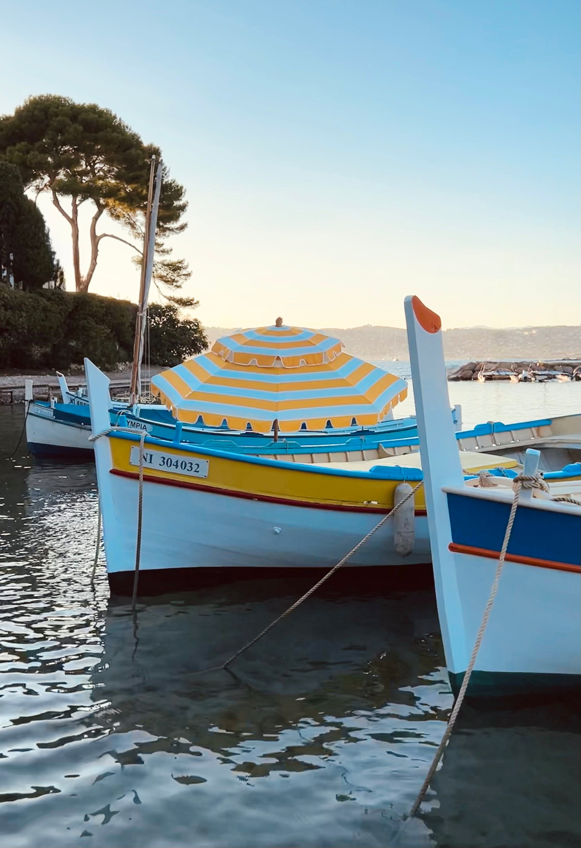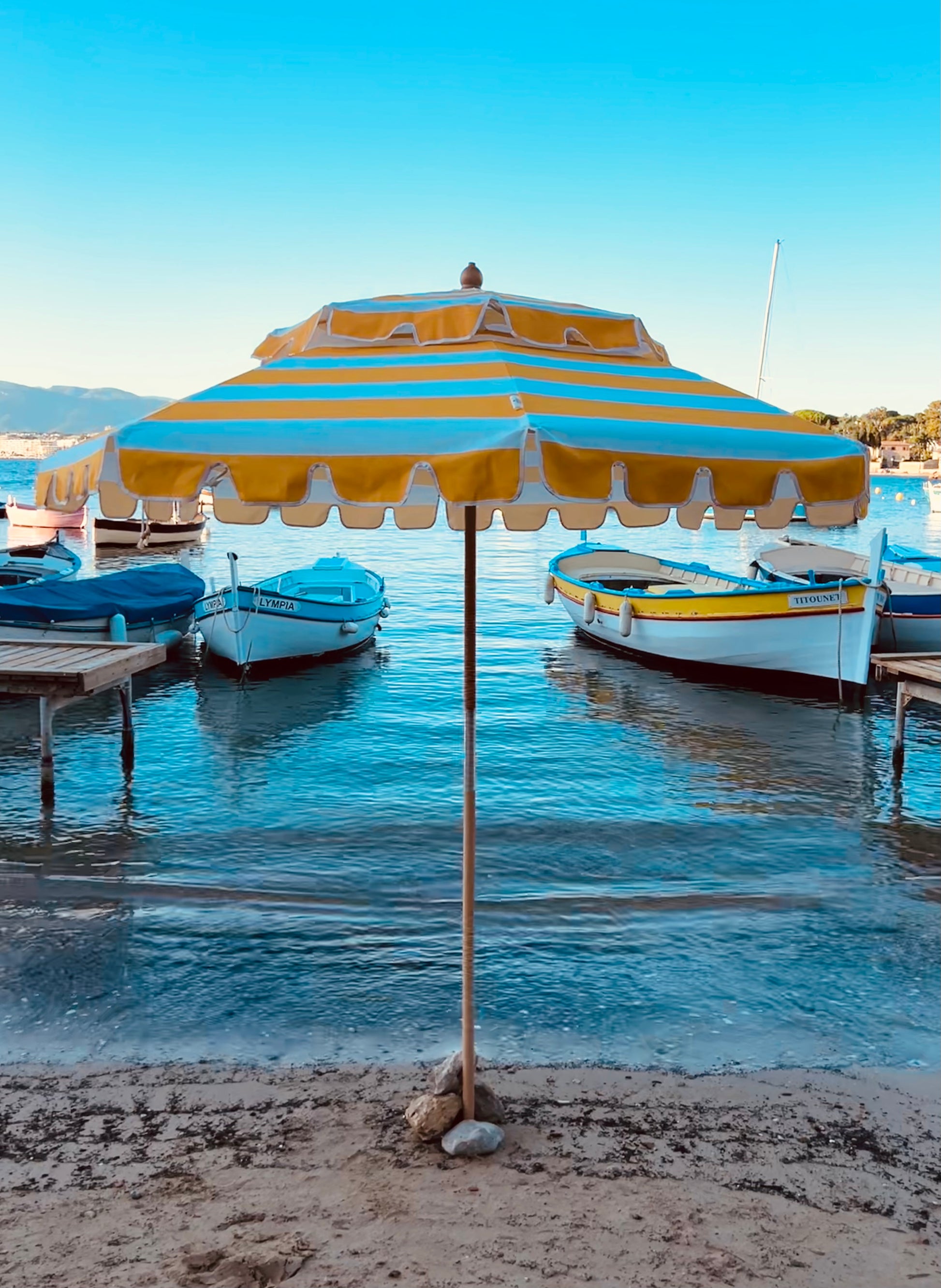 Bella vista är bredrandigt i gult och vitt. Detta parasoll skapar rivieravibbar som inget annat, den för tankarna till soldränkta dagar och viskar om guldkantade sommarkvällar