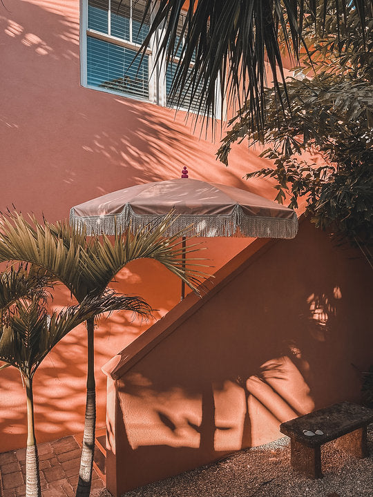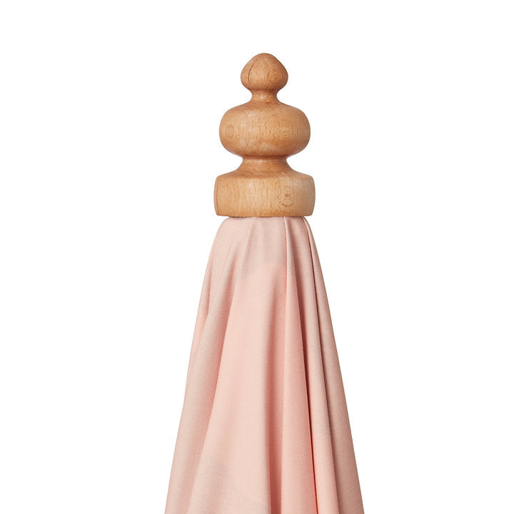 Parasollet Hippo är ett färgstarkt personligt parasoll med lekfulla detaljer som bomullsfransar och svarvad handmålad knopp som finns i färgerna cerise och oljad svensk bok.