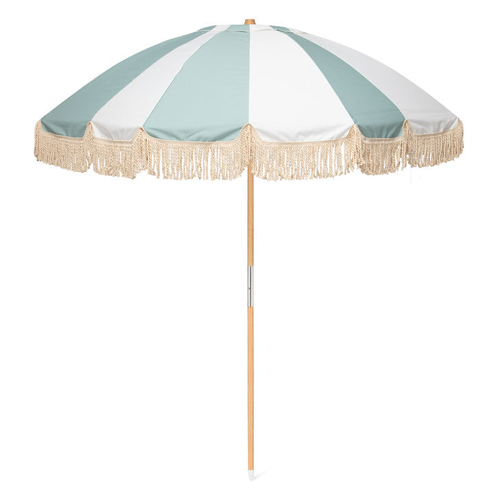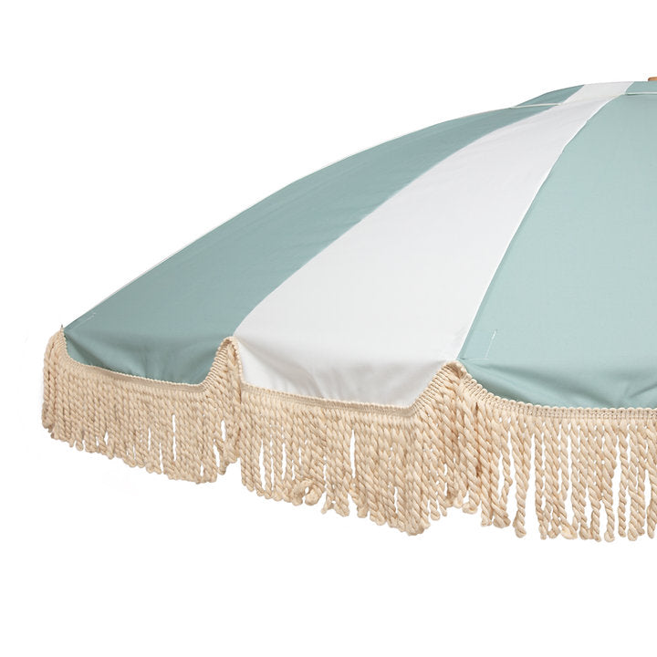Tavira är blockrandigt i vitt och pistachgrönt med naturfärgade bomullsfransar. Det delbara skaftet  gör det enkelt att fälla ihop och plocka undan.