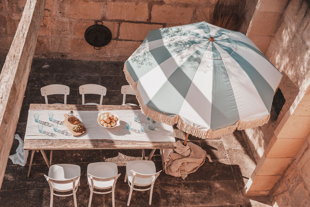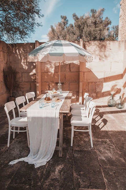 Tavira är ett av våra större parasoll och gör sig perfekt över det dukade bordet.